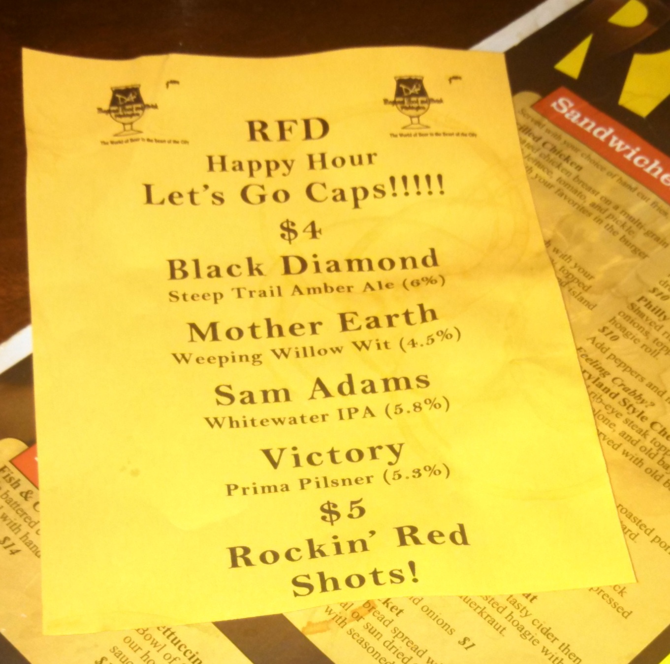 R.F.D. Washington, website, Facebook, Twitter, 810 7th St. NW (7th & H), opens at 11a everyday, HH 3-8p everyday, Distance to Verizon Center: 900 feet (Brought to you by DC Sports Nexus), est. 2003 [Yelp, WaPo, Tripadvisor, Beeradvocate]