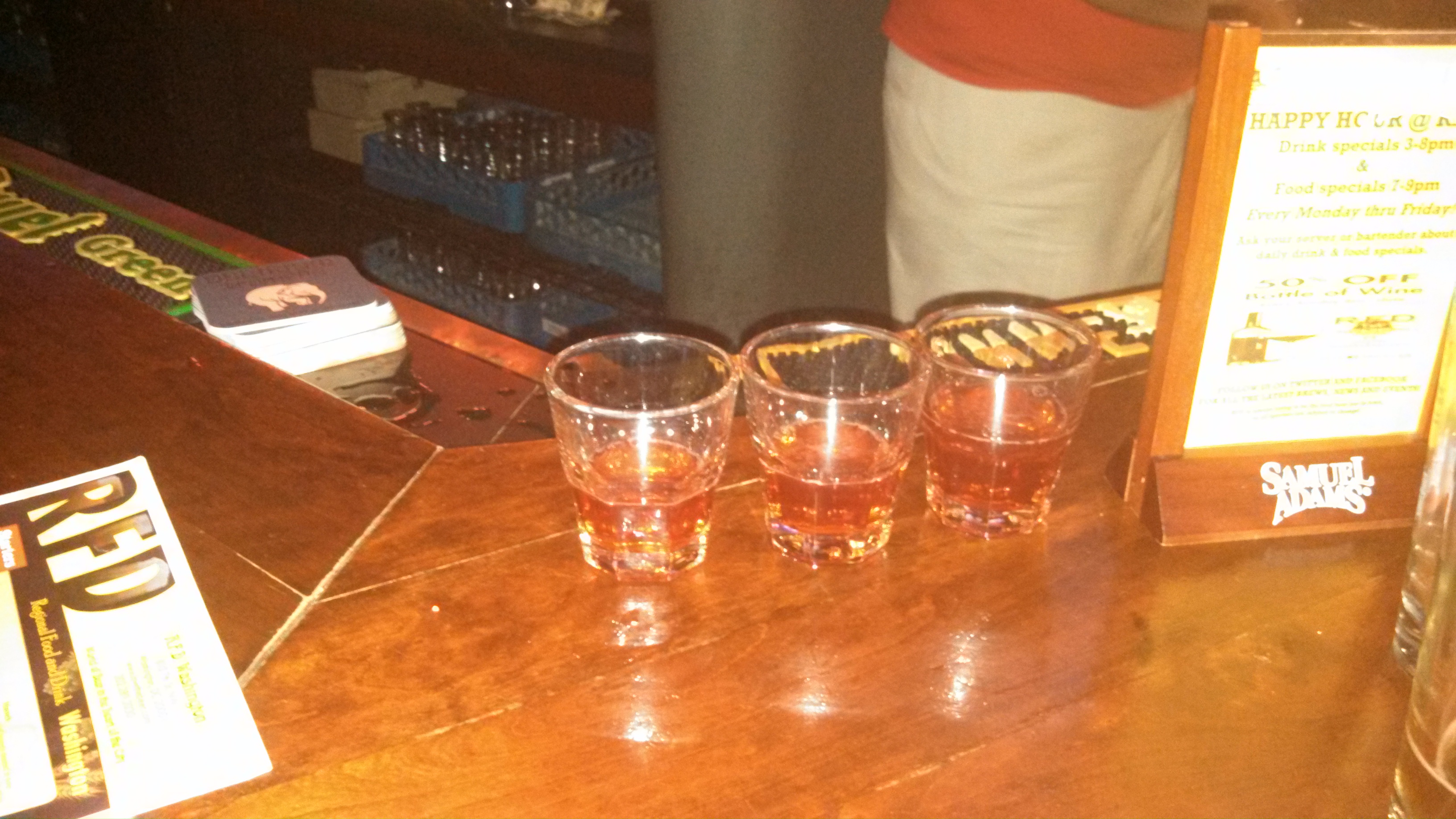 I recently stopped by before a Capitals playoff game; happy hour until 7p includes four different $4 craft draft beers-all solid, unique, and new to me-along with a skip-it $5 “Rockin’ Red” shot (Finlandia cranberry flavored vodka, Triple sec, and a splash of cranberry juice) (see above for HH menu and below the Caps shots). Beers normally are the standard craft-beer price, $6-8. The bar, probably because it is so huge, is full of folks in red jerseys but not too crowded even before a sold-out playoff game.