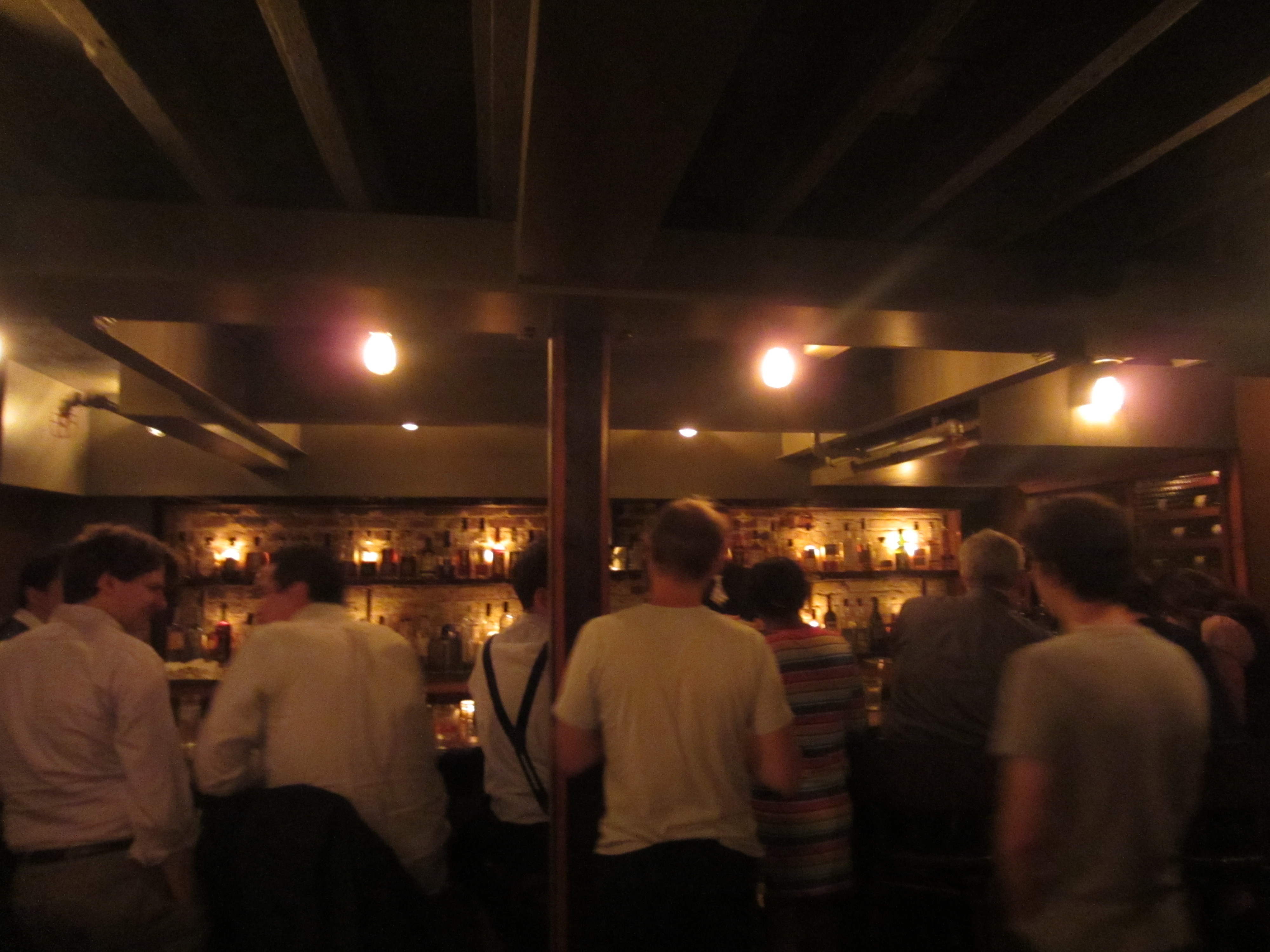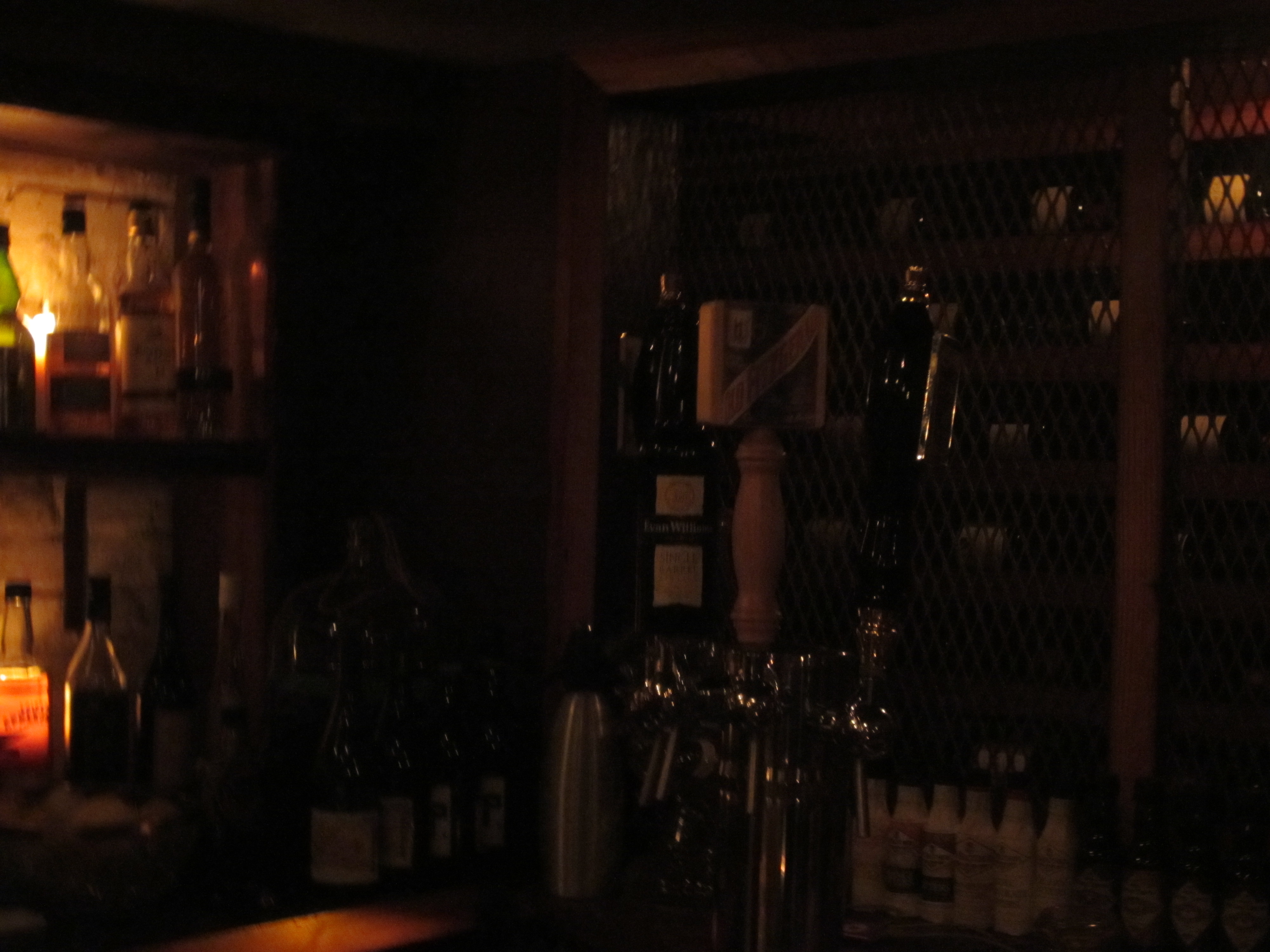 The more sedate Dining Room on the first floor is impressive for the shelves and shelves of booze (mostly bourbon and other types of whiskey) that line its walls, evoking the coolest library ever. Many of the reported 1,600 different kinds (“the largest publicly available collection of whiskey in North America” according to one report) of whiskey that Jack Rose possesses are on these shelves.  Because it’s more relaxed than upstairs, this is a better place to sample some of the amazing spirits on offer. A dining area makes up two-thirds of the room, separated by a railing/partition from the long bar makes up the rest; I could do without this partition, which forces patrons at the bar to squeeze into a smaller space when crowded.