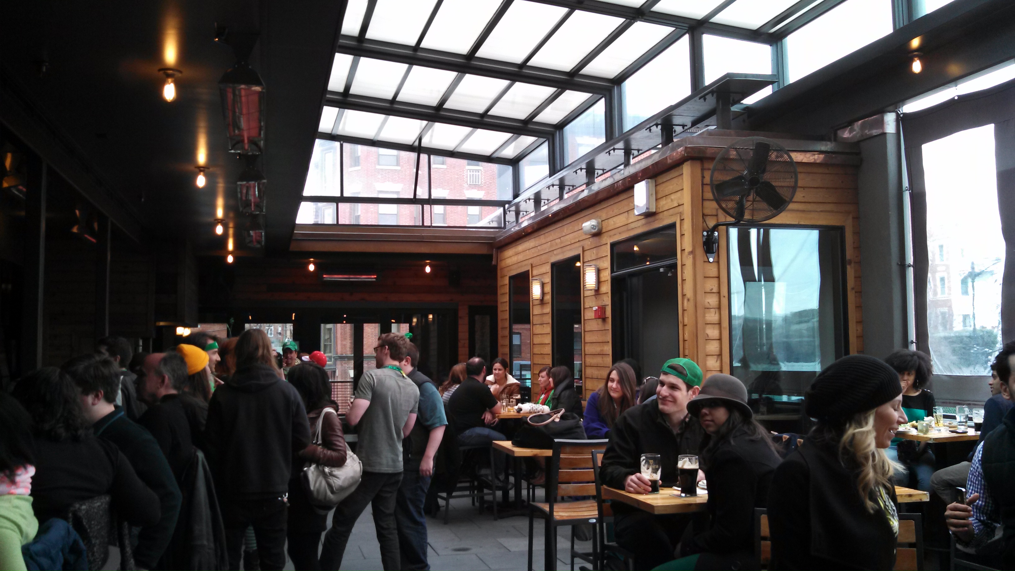My visits to Jack Rose are usually spent at its second-floor Open-Air Terrace bar, reached by the stairwell that greets visitors at the front entrance (the folks who make up the fast-moving line that often forms on weekends are typically waiting to go up here). This expansive rooftop space, carved out of the second floor of a former boxing gym, can be enjoyed all year long; the long bar that occupies one side of the space is covered by a permanent roof, while the other half, with high-top tables, can be covered by removable glass panels when it rains or the temperature goes down.  The wall to the north provides a great view of 18th Street and the rest of the Adams Morgan neighborhood (sometimes clear plastic panels are hung to protect folks from wind and cold) .  A host of craft beers (mostly $7-8) and cocktails can be ordered from the friendly and knowledgeable bartenders, who do a great job of taking orders even when the place gets crowded, as it often does on weekend nights from 10p-1a. The crowd upstairs skews slightly younger than the rest of Jack Rose; but the lack of cheap beer (often only 1 light beer available) and other typical 18th Street specialties (I overheard a bro and his young lady friend lamenting the lack of Red Bull on a recent visit) means that this bar isn’t overrun with 22 year olds like the rest of the hood further north. Tasty bites cooked on the wood-fired grill upstairs can be ordered earlier in the evening if hungry.