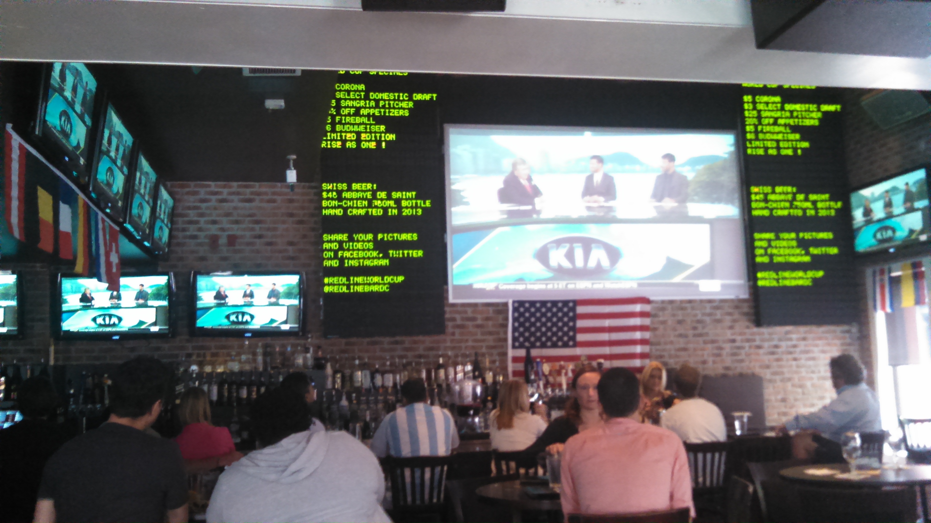 We started off inside at Redline, where a crowd quickly materialized to enjoy 20% off the solid apps and $3 domestic drafts (including Goose Island 312, Shock Top and Bud Light) while watching the plethora of TVs on display (fun group of Ghana fans added to atmosphere).