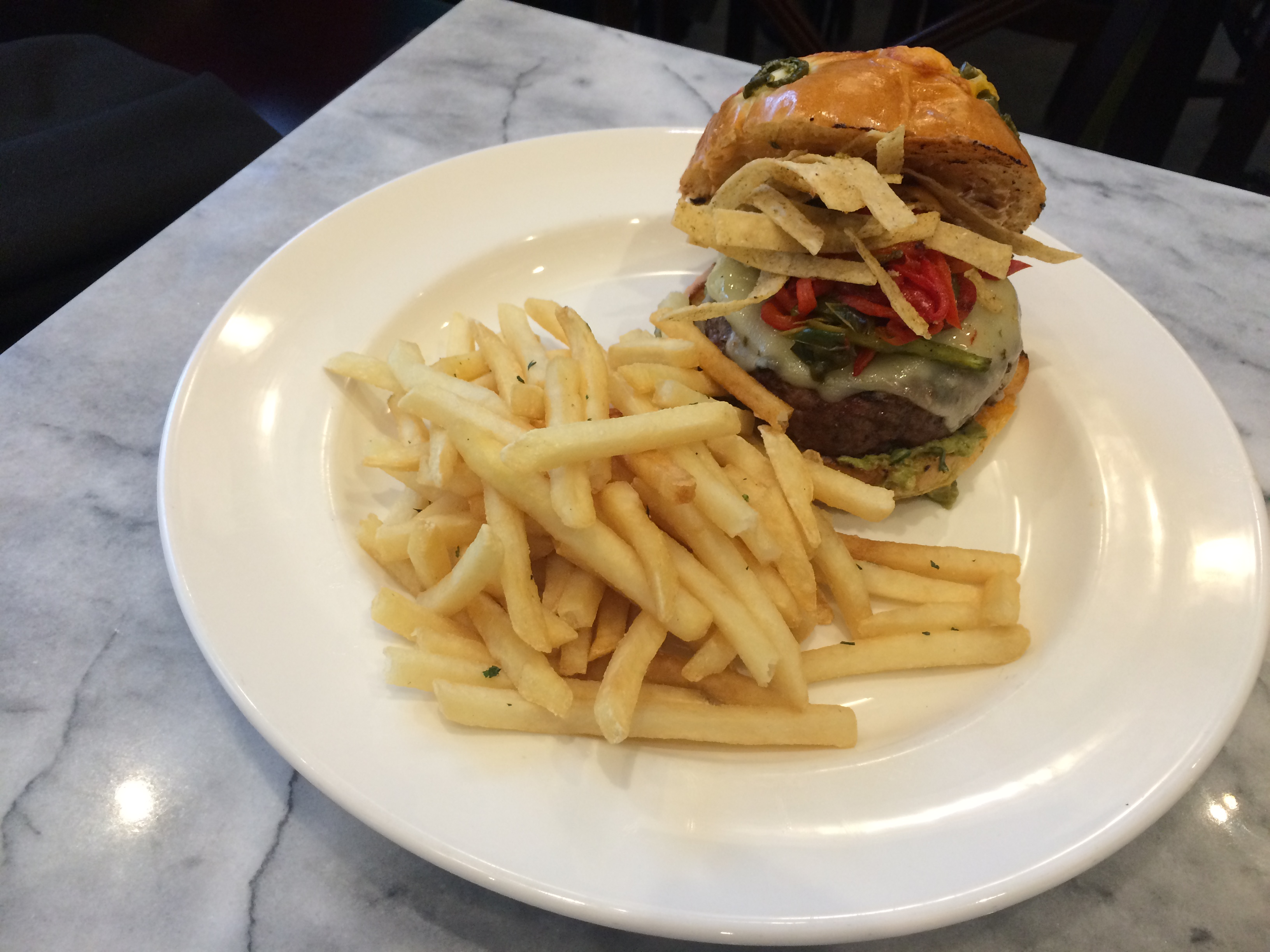 T Coast (named as an homage to Tortilla Coast, part of same chain): two types of peppers (red peppers and jalapeños) and pepper jack cheese, house made avocado spread (which cuts down on the heat), topped with crunchy cumin-dusted tortilla strips, between halves of a stunningly tasty and handsome jalapeno cheddar bun;