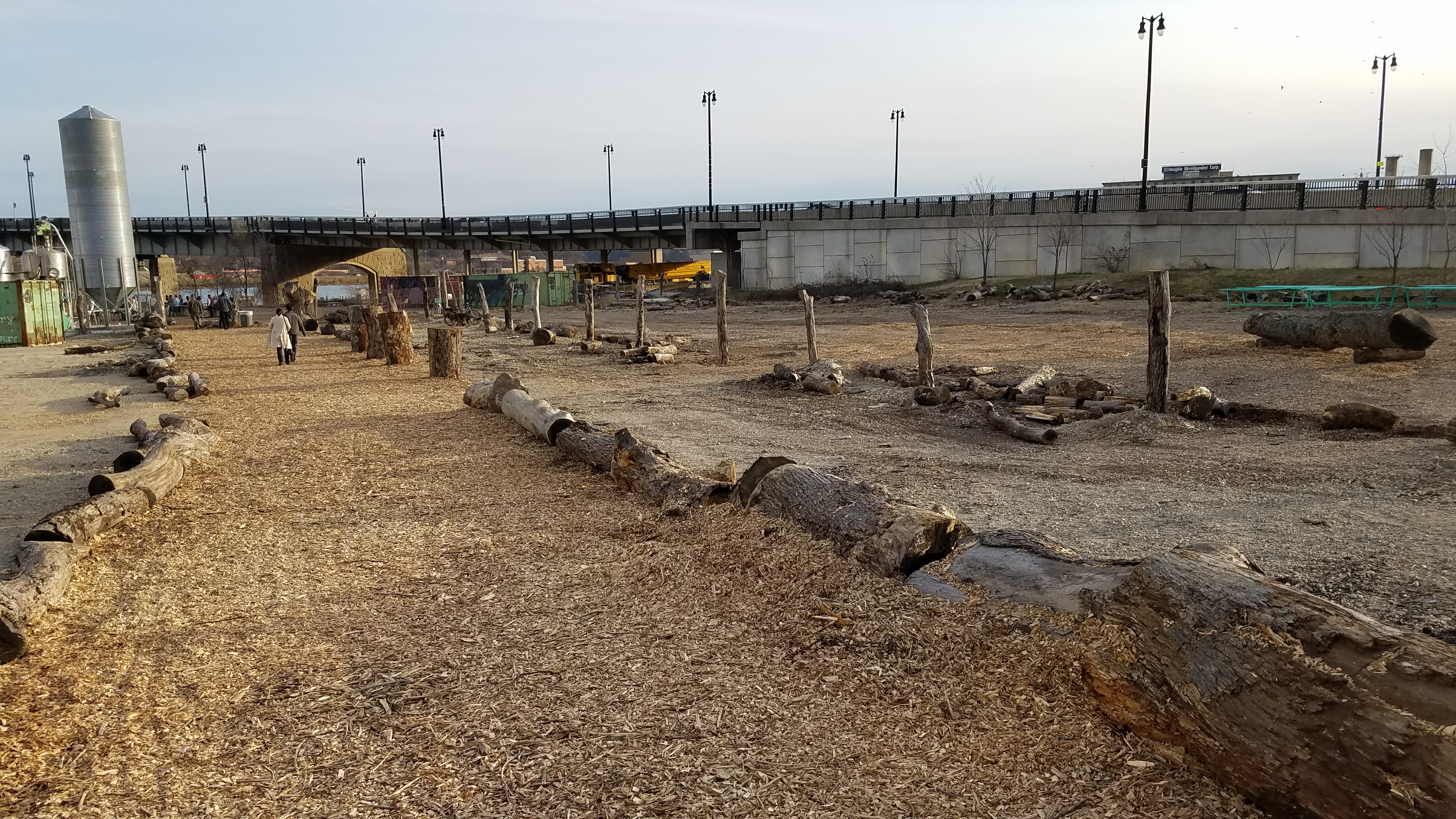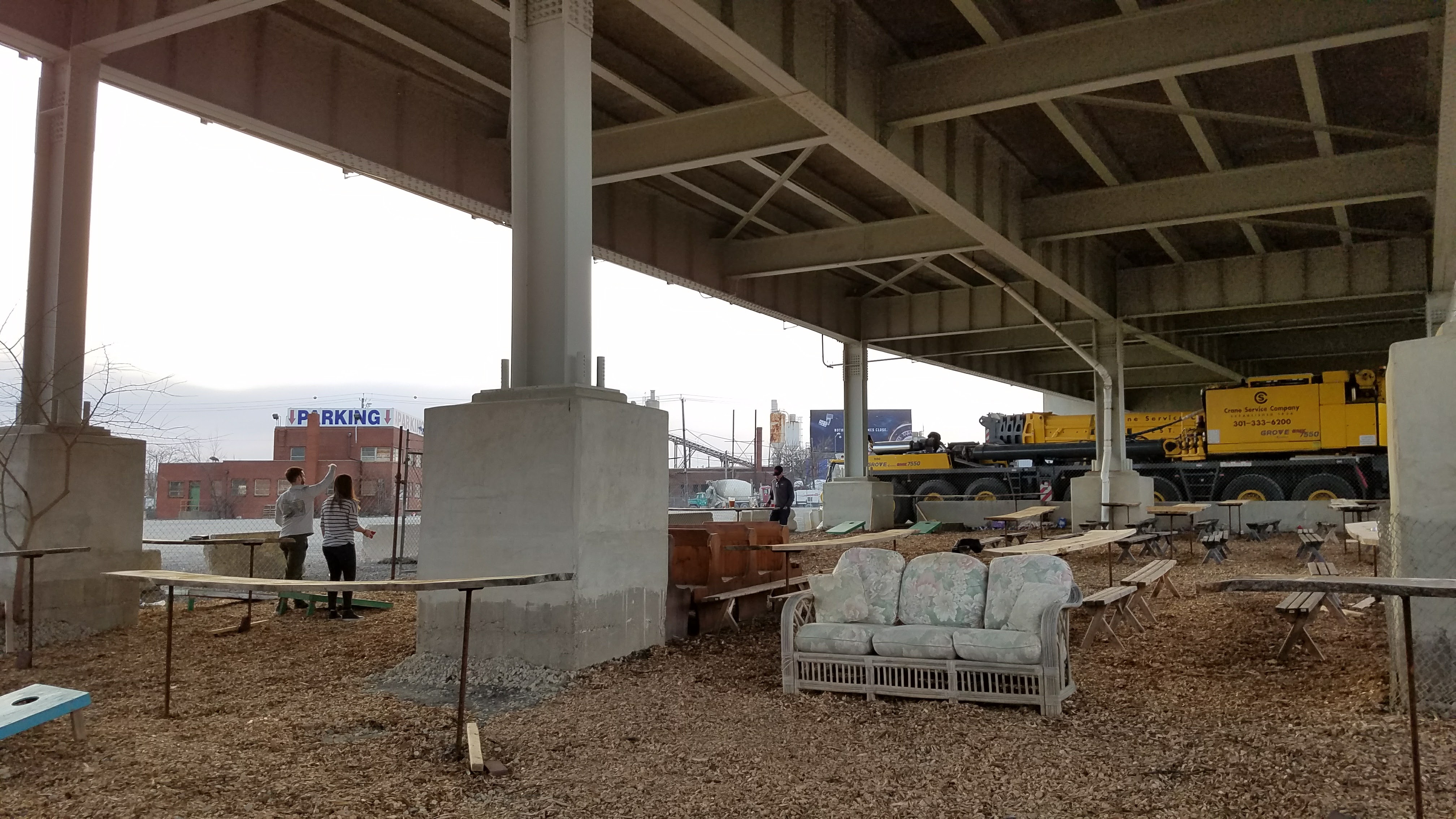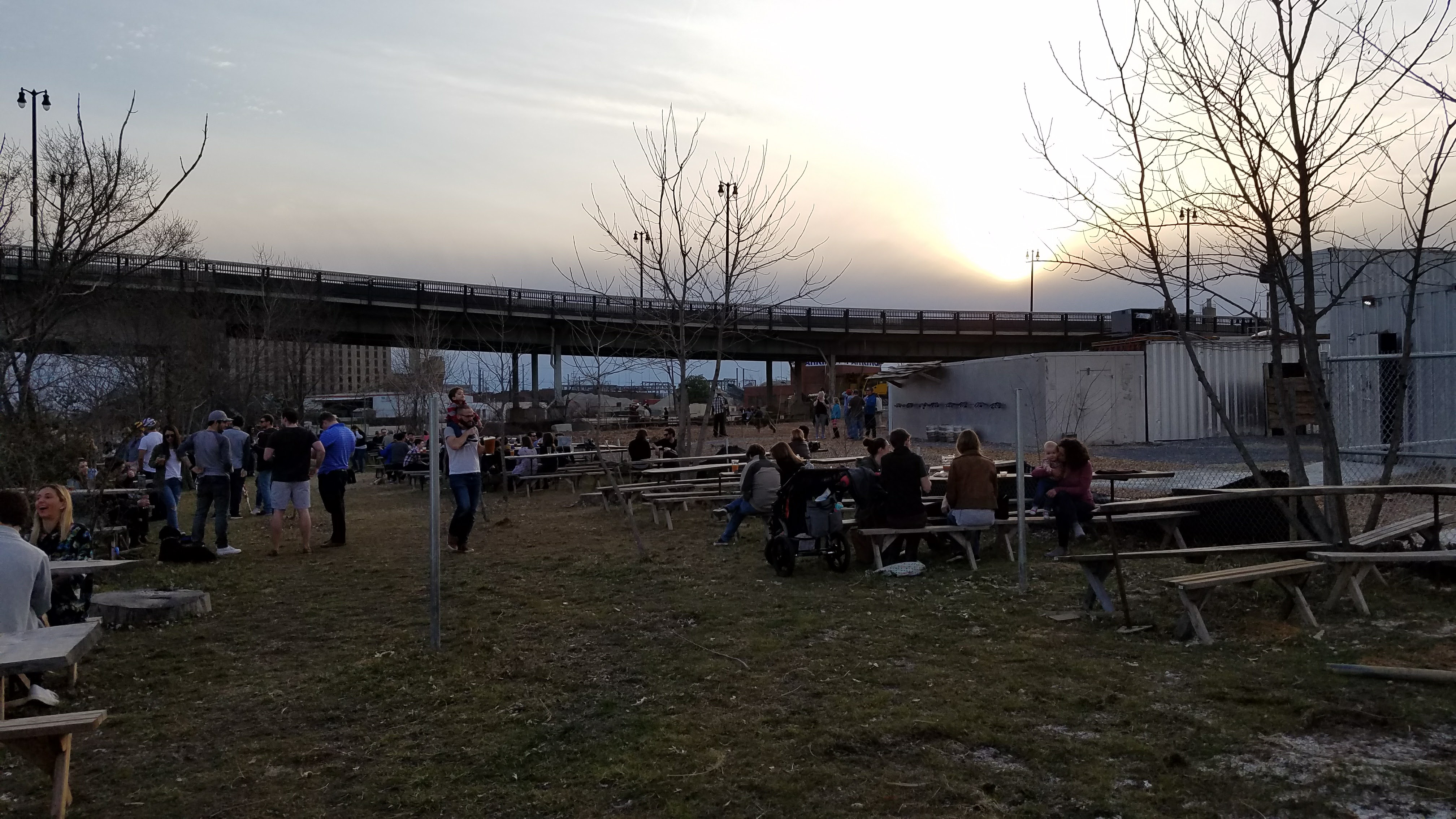 Barred in DC stopped by on the opening day Saturday, along with around 150 people and 25 dogs. If you ever frequented the now-shuttered Trinidad brewpub on Bladensburg, the vibe is roughly similar, though less post-apocalyptic; there’s still nothing else like it in DC. The entrance, about a 10 minute walk around the stadium from the Navy Yard Metro (Ballpark side) stop, is on Potomac Ave. SE, directly across the street from where the Nationals play. Unlike the old space, which was mostly grass and weeds, Bardo’s patrons walk on gravel paths and an enormous amount of wood chips. 50 or more wood tables are concentrated along the river and under the Frederick Douglass Memorial Bridge (S. Capitol Street), while there’s plenty of open space where folks let their dogs roam (right now dogs are allowed to be off-leash throughout, so be forewarned or heartened; Bardo says that a separate off-leash space is forthcoming). Also underneath the bridge are numerous cornhole sets and a sweet couch. The bathrooms are set up 30 feet behind the bar in separate shipping containers; the men’s urinals were repurposed kegs.