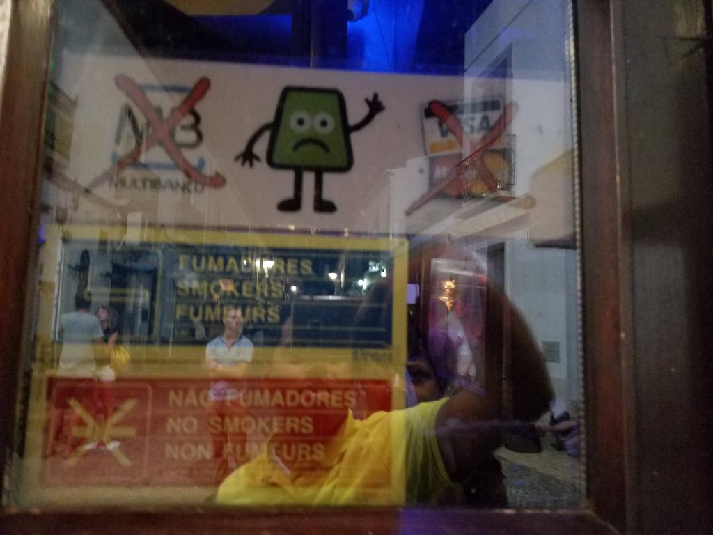 Because open container laws are not really a thing in Europe, particularly Portugal, it was common at many bars for the bartender ask if we wanted a drink for “take away”; if we said yes, they would pour in a plastic cup so we could drink on the street (even when there’s no sidewalk patio) or walk to the next spot. This was helpful as unfortunately smoking in bars isn’t prohibited (note this is not true for restaurants) by law so in some spots it was better to be outside. Of note, although credit cards were accepted at most restaurants and businesses, it was hit or miss whether they could be used at bars (you’ll see a “No Multibanco” sign or, more amusingly, a graphic with a picture of Visa and Mastercard with a big X on them). Many restaurants didn’t actually have bars with seats; just service bars to serve drinks for seated diners. Bars close at 2a generally, but many seem to be allowed to be open until 4a (unclear why).