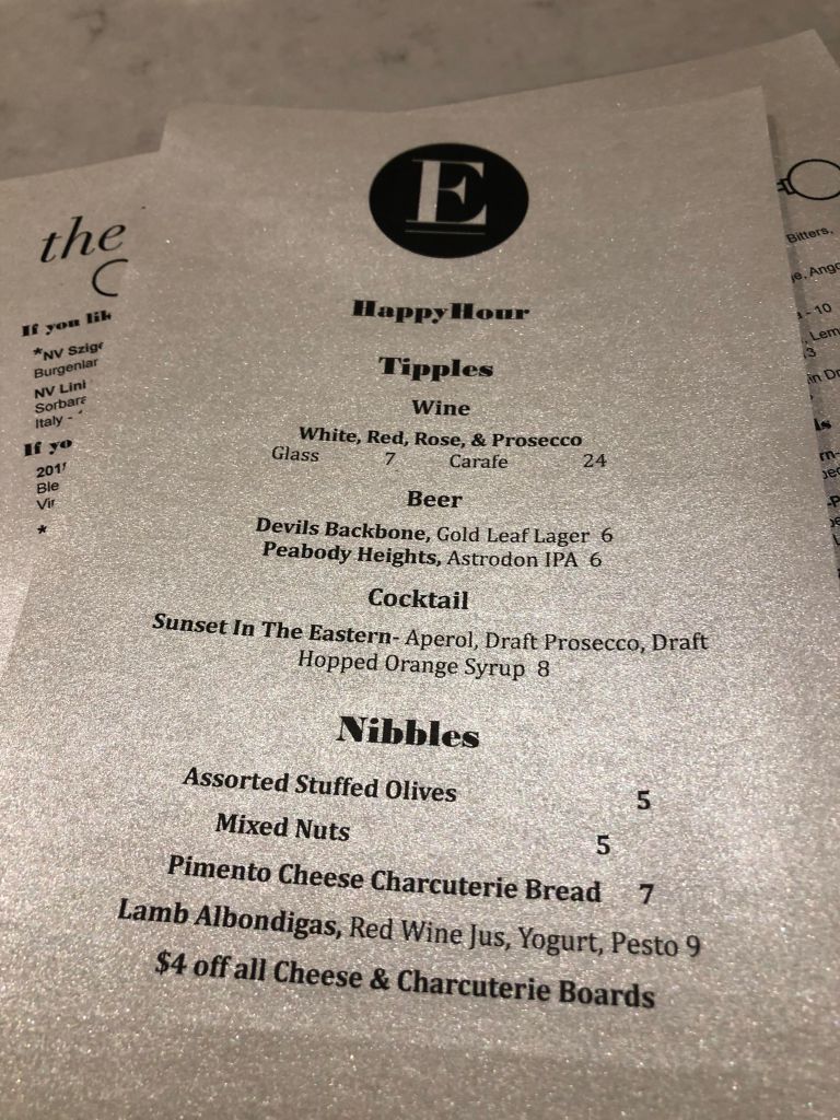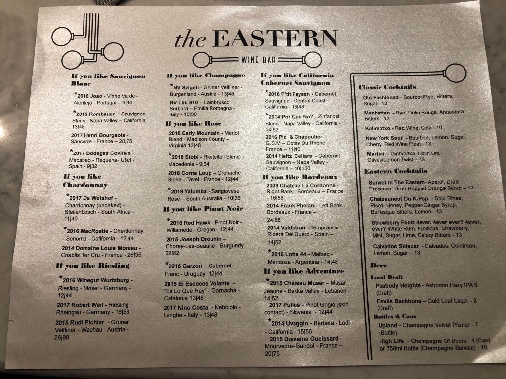 The Eastern will feature 35-40 wines by the glass (median price seems to be around $12-13); menu is smartly divided into categories based on popular types of wines. Several of the wines will be on draft, as will a couple beers (you can get a 750ml champagne bottle of High Life for $10). A small list of cocktails include a great wine cocktails like the Kalimotxo from Basque country in Spain (red wine and coke) and the refreshing Port and Tonic (popular in north Portugal). Lots of whiskeys too-so if you’re someone like me who can go without wine, this will still be a great place to check out. There will be a HH 4-7p M-F (opening HH included $7 house wines, an $8 riff on an Aperol spritz, $6 beer, and several food options). A firmly-tongue-in-cheek $10 “champagne” service of a 750ml bottle of Miller High Life, the champagne of beers, will be offered (you can get a standard $4 12 oz. option if you life).