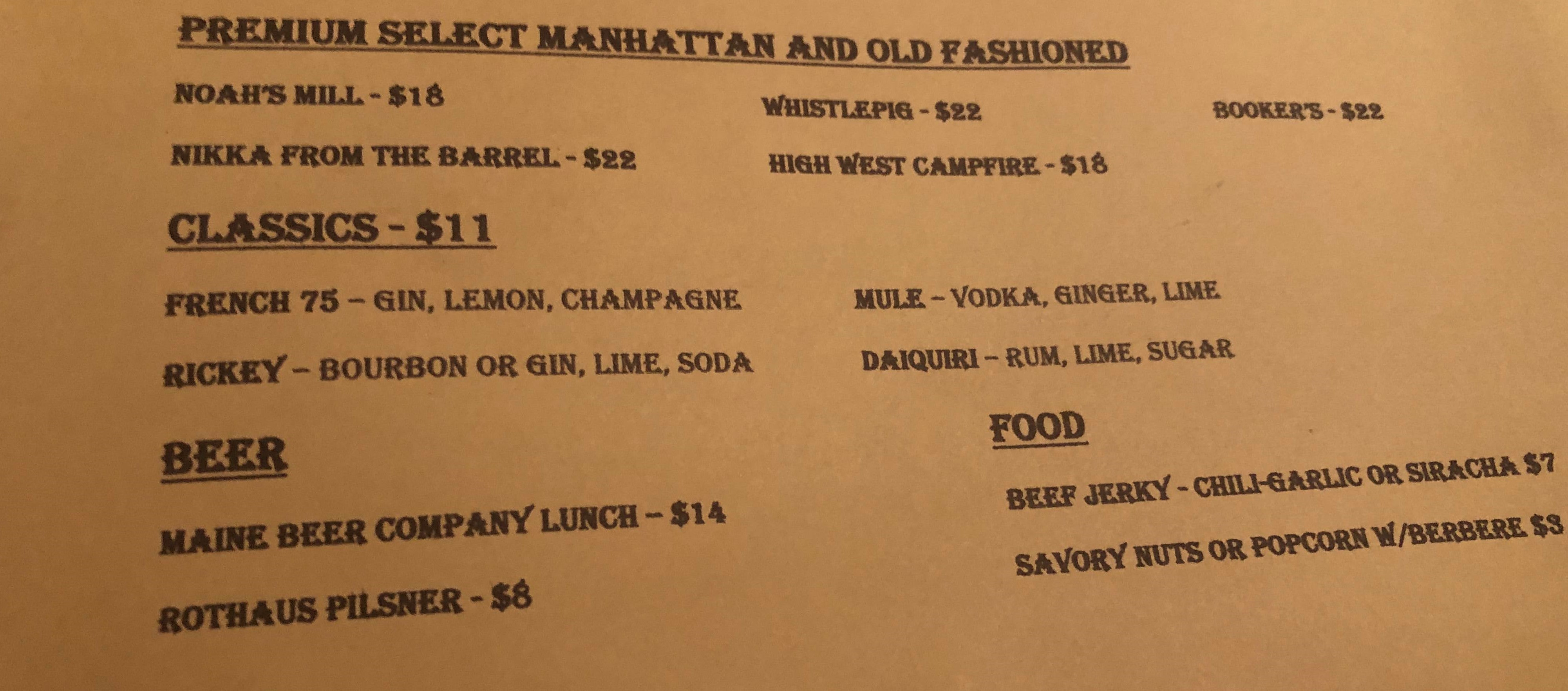 To comply with ABRA regulations, a short snack menu of housemade beef jerky ($7 chili-garlic or siracha were the flavors available early), savory nuts ($3), or popcorn w/ berbere ($3) is available.