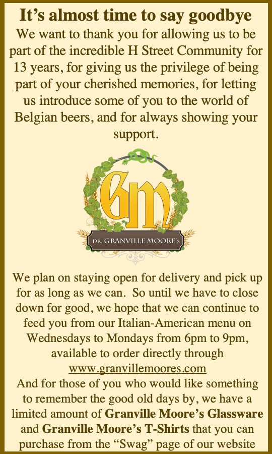 Granville Moore’s, the great Belgian food/beer H Street spot, will permanently close, co-owner Ryan Gordon confirmed to me today. He stated via Twitter: