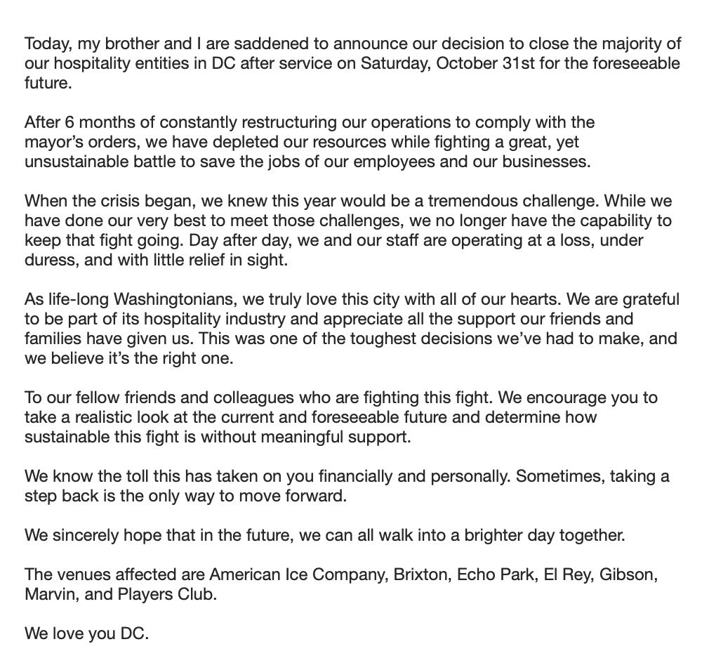 In news that stunned many in DC (though should not be shocking if you’ve been following what’s been going or saw some tweets), Eric and Ian Hilton announced (via Laura Hayes) yesterday that U Street area spots American Ice Co., Brixton, Echo Park, El Rey, and Gibson would only remain open until October 31st, and, along with Marvin and Players Club which never reopened after closing mid-March, would close “for the foreseeable future” after that. Whether they come back in the spring will likely depend on a number of factors including any breaks landlord gives (I imagine one reason closing is because they feel they are in better negotiating strength being completely closed vs limping along), customer demand in next 6 weeks, and of course how the pandemic/treatment is going at the time.