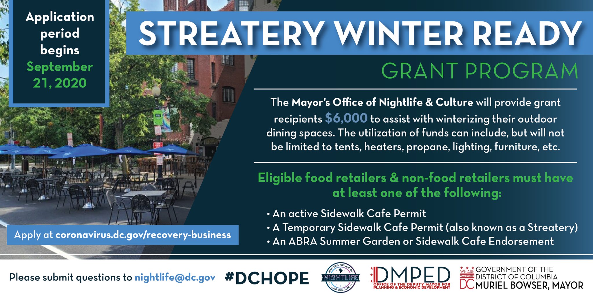 Under the $4 million program, DCMONC will issue $6,000 grants to “help businesses defray outdoor dining winterization costs.” These one-time grants will be provided to establishments that are offering outdoor dining in the District for future costs only for outdoor dining winterization purposes and to maintain outdoor dining operations to include tents, heaters, propane, lighting, furniture, advertising/marketing of business, and outdoor dining operational costs. The FAQ provides helpful information.