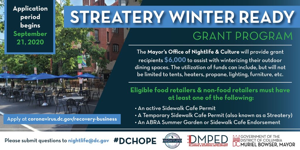 My reaction is that this more than I expected. I had argued last week that DC needs to do something, and I was hoping just for bulk purchase pricing on heaters and reduced fire permit fees. The grant program doesn’t include reduced or waived fees, but I’ve been told that news of that should be coming soon. Although for many (most?) spots, this won’t pay for full winterization (heaters that restaurants use can cost $1500/each, portable heaters you may use for your own patio are a few hundred), $6000 is meaningful and will allow spots to get some revenue this winter for on-premises dining/drinking and may cause some spots to decide not to close for the winter (or permanently).