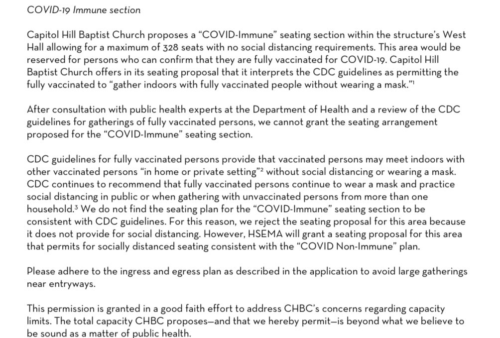 DC did grant the church’s waiver request to allow 500 people indoors (110 outside) in 7 different sections for their “Non-Immune Seating” with social distancing (at least 35% capacity, but possibly 45%). This is higher than the Mayor’s order which limits capacity to 25% or 250 persons, whatever is lower.