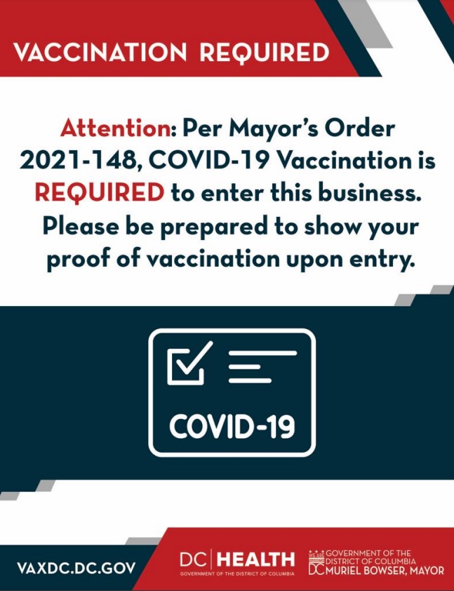 This “city-wide vaccination entry requirement,” termed VaxDC by the DC government, will require customers, visitors, and patrons (but not staff) age 12 and over to be vaccinated, starting Saturday, January 15, 2022 (full vax Tuesday, February 15th), in the following indoor establishments: indoor eating/drinking, cultural/entertainment, exercise/recreational , and event/meeting spaces. DC is the 11th major US city to announce a vaccine mandate like this one.