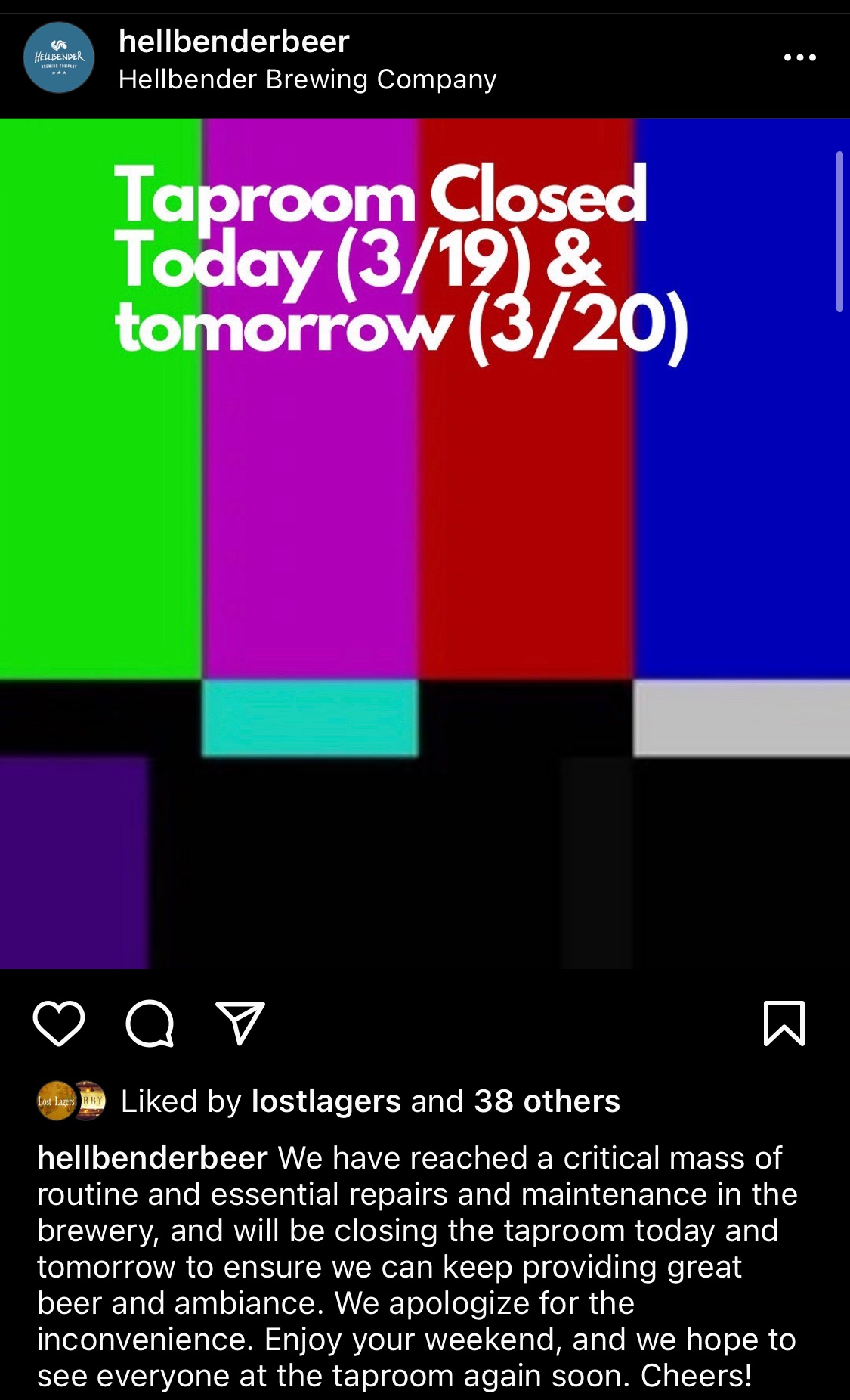 Hellbender Brewing Company, which opened in November 2014, has not been open since last Friday, March 18th. On Saturday, the brewery posted a message on their Instagram, stating that they had “reached a critical mass of routine and essential repairs and maintenance in the brewery, and will be closing the taproom today and tomorrow to ensure we can keep providing great beer and ambiance.” They are normally closed Mondays and Tuesdays, and again posted Wednesday afternoon (3/23) that their “Taproom Will be Closed Until Further Notice.”