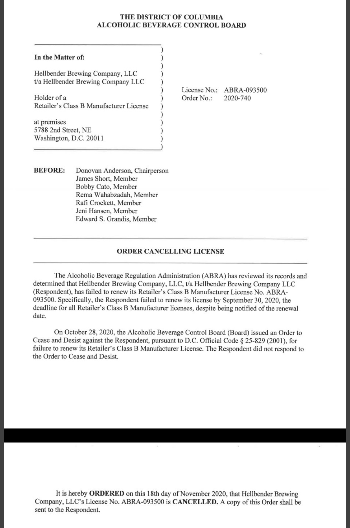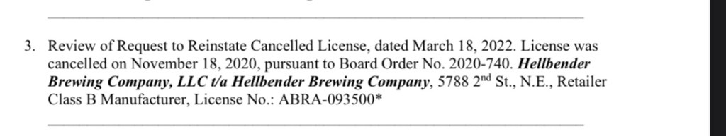 I’ve learned that the popular brewery has been closed, not necessarily due to repairs, but because their ABRA manufacturer Class B (brewery) liquor license was cancelled by the ABC Board on November 18, 2020 because they failed to meet the September 30, 2020 renewal deadline and failed to respond to a cease and desist order on October 28, 2020. Meaning, Hellbender has been operating (likely completely unintentionally) without a liquor license for 16 months.