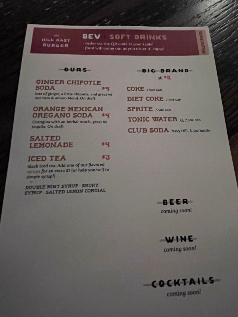 HEB’s opening menu features 3 types of burgers made with a blend of Sloppy Mama’s BBQ prime brisket trim & Roseda Farms grass-fed aged beef on a local potato bun (can get it on arugula if you so desire). I ordered the Puebla, which has poblano relish, beefonaise, smoked cheddar, mustard, and pickles – tasty. Burgers are priced $12/$15/$18 (single/double/triple patties); seasoned curly potato wedges or salad is $5 extra. The food menu also includes a fried chicken thigh sandwich, fully dressed half smoke, chili, nuggets, and basically a veggie burger made with a patty made of grits and black eyed peas. Ordering is via QR code/Toast (except at the bar it seems), with a 20% service fee “which contributes toward staff pay.”