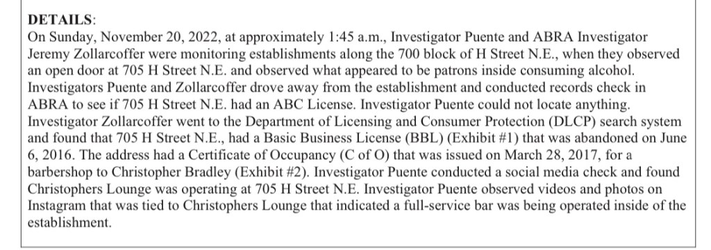 On Wednesday (12/7), the DC ABC Board ordered a bar operating in a former barbershop space at 705 H St. NE to cease and desist operating as a bar. The bar, Christopher’s Lounge, does not have a liquor license (nor the correct regulatory licensing), and you can’t do that. ABRA investigators were not apparently tipped off, they just spotted it while doing their rounds the Saturday night before Thanksgiving. The investigators checked social media to confirm.