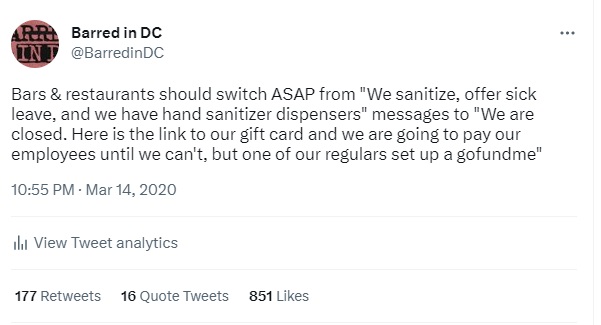 March 14, 2020: Just a couple days before DC restaurants/bars are shut down for 10 weeks, post this kind of silly tweet in retrospect. The next day, 10,000 Twitter followers are hit, then quadrupled in 3 years. The next year involves being interviewed by most of DC local news stations over Zoom plus livetweeting’s Mayoral press conference, posting weekly vaccine data, and stuff I definitely never thought I would do (didn’t goto a single bar for 13 months)