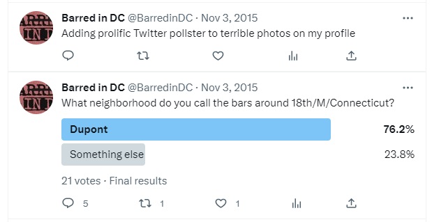 May 10, 2016: Approximately when “POLL -” starts before each Barred in DC Twitter poll.