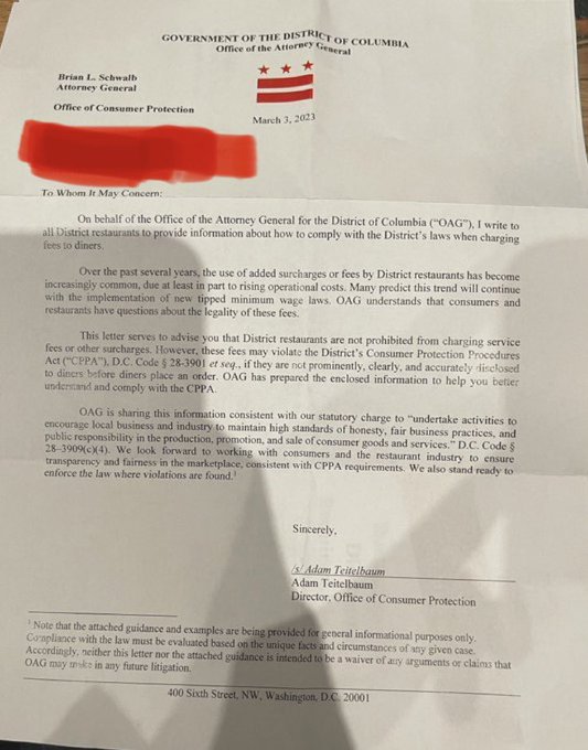 Also, as first reported by Barred in DC, and then followed up with real reporting by Axios, the Attorney General sent copies of the letter posted above to nearly 2,500 DC restaurants, due to consumer complaints. The letter promises education first, but the Consumer Alert linked above only mentions enforcement and a consumer complaint hotline.