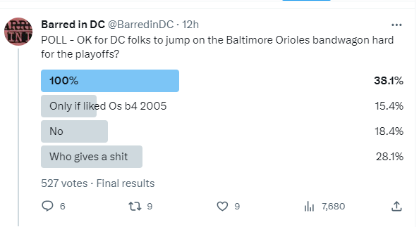 The Baltimore Orioles, which was the only Major League Baseball team in the DC area from 1971-2004, just had its best regular season in over 4 decades and won the American League East. They play in the ALDS against the Texas Rangers: Game 1- Sat Oct 7 at 1p; Game 2-Sun Oct 8 at 4p; Game 3-Tue Oct 9 at 8p. Games 4-7 TBD.