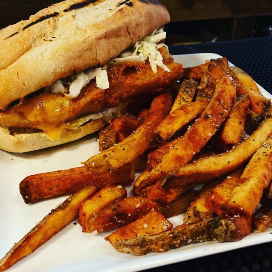 - Batter-fried Atlantic Dogfish, served on a baguette with house-made remoulade, lettuce, tomato, and pickles.