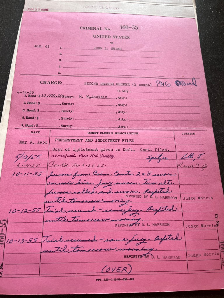The murder trial presided by Federal district judge James Morris started on October 11, 1955, six months after Watson’s death. Despite a 50/50 gender-balanced jury pool to choose from, only 1 woman was impaneled on the jury of 12 (plus 2 alternates). At the trial, Dodson argued that Suber had acted in self-defense because he reasonably feared that his son would suffer bodily injury or worse, and that the Suber men were legally allowed to use reasonable force to eject someone from the premises. During the trial, witnesses, including Vincent Suber, testified that Watson had caused trouble in the establishment previously and had been banned. Exhibits introduced at the trial included the revolver itself, and photos of the establishment, as well as an incriminating statement made by John Suber to MPD and the Riggs National Bank deposit slip that listed Watson as banned from the premises. After a little more than 3 days of trial, on October 14th, the jury deliberated, and found Suber not guilty of 2nd degree murder, but guilty of the lesser charge of manslaughter.
