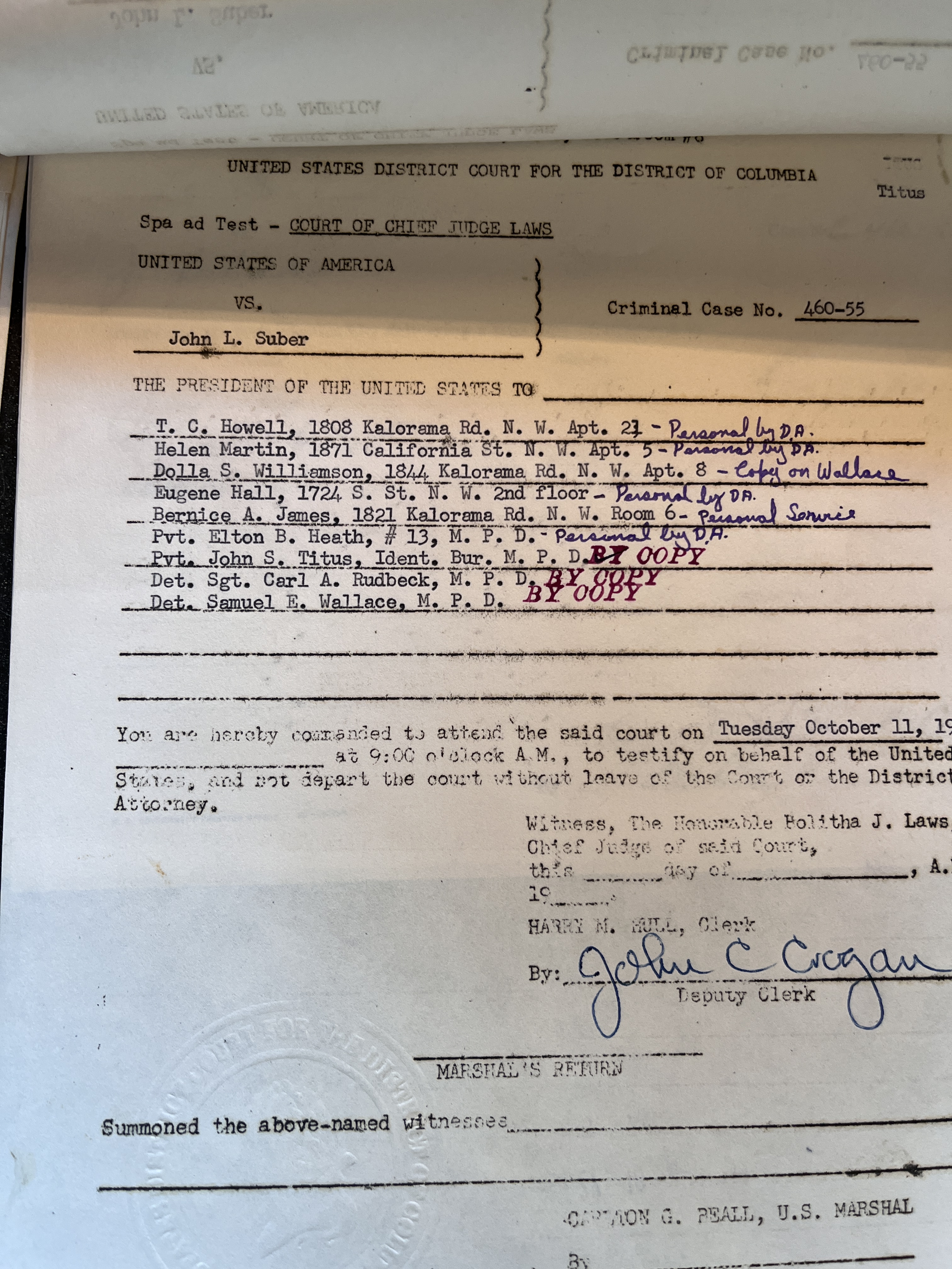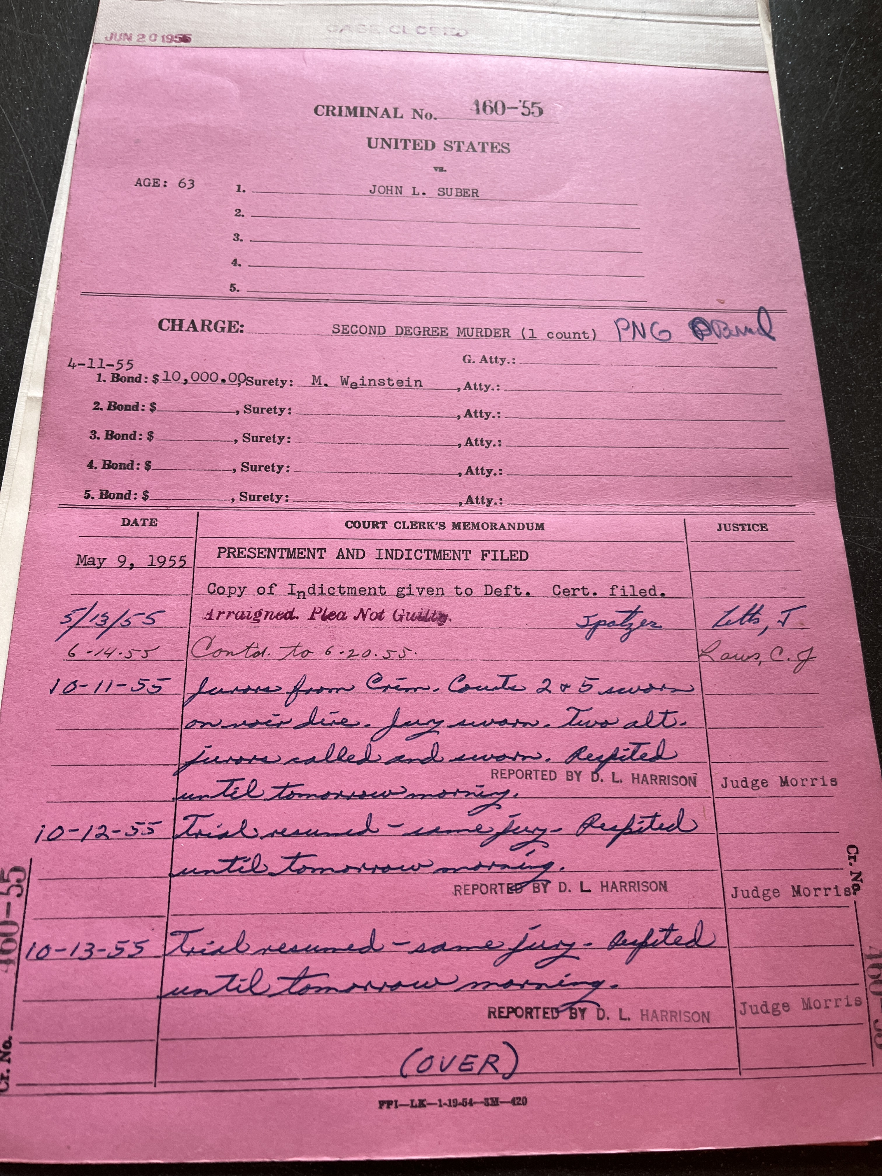 The murder trial presided by Federal district judge James Morris started on October 11, 1955, six months after Watson’s death. Despite a 50/50 gender-balanced jury pool to choose from, only 1 woman was impaneled on the jury of 12 (plus 2 alternates). At the trial, Dodson argued that Suber had acted in self-defense because he reasonably feared that his son would suffer bodily injury or worse, and that the Suber men were legally allowed to use reasonable force to eject someone from the premises. During the trial, witnesses, including Vincent Suber, testified that Watson had caused trouble in the establishment previously and had been banned. Exhibits introduced at the trial included the revolver itself, and photos of the establishment, as well as an incriminating statement made by John Suber to MPD and the Riggs National Bank deposit slip that listed Watson as banned from the premises. After a little more than 3 days of trial, on October 14th, the jury deliberated, and found Suber not guilty of 2nd degree murder, but guilty of the lesser charge of manslaughter.