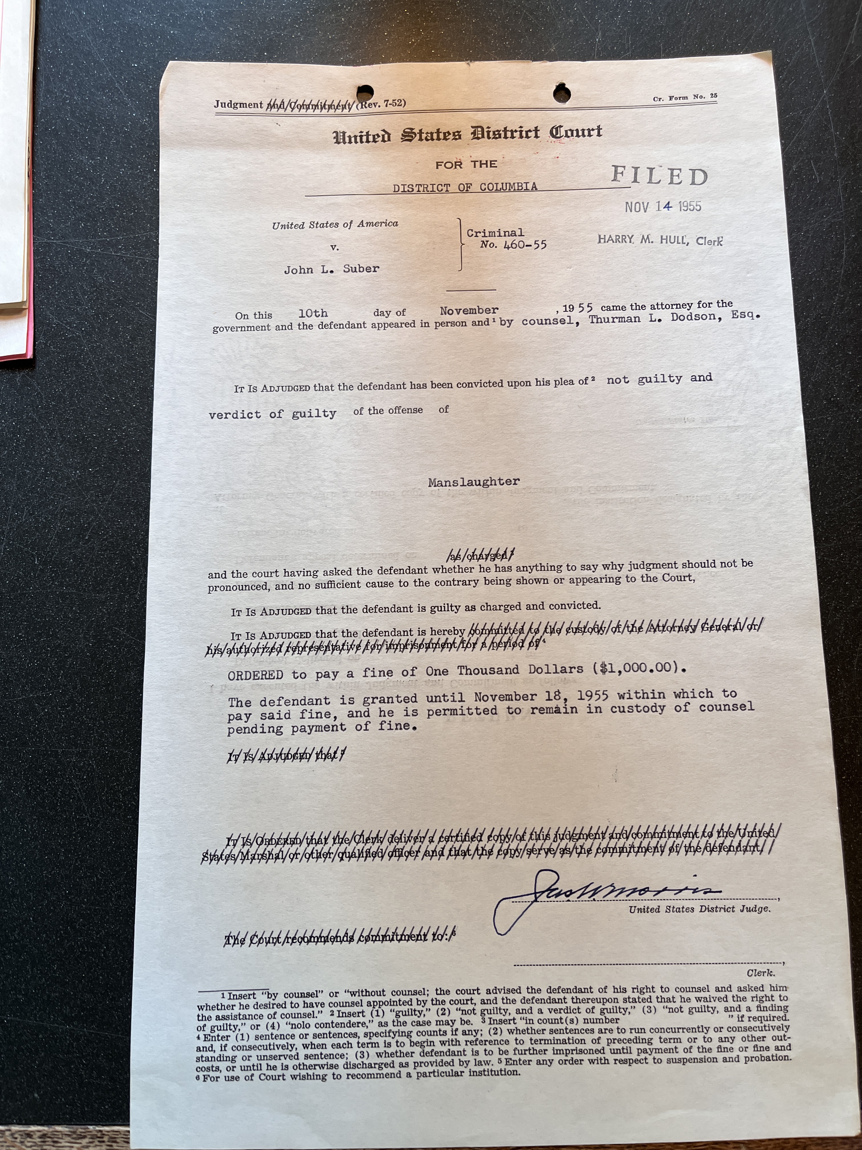 Before sentencing, Dodson submitted certificates from medical professionals stating that, based on Suber’s poor health, even a short imprisonment might endanger his life. On November 11, 1955, Judge Morris, after reviewing those medical certificates, and taking into consideration other facts of the case, issued his sentence to Suber: No jail time and a $1,000 fine (~$12,000 in today’s dollars), which was paid later that month.