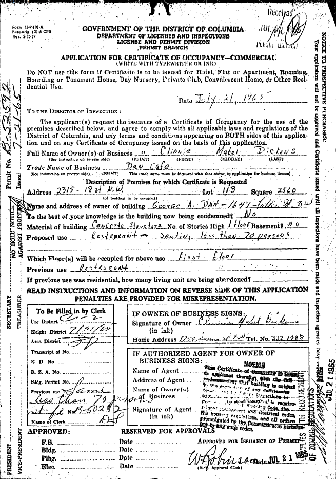 [This provides details that did not fit into the author’s stories found in “How A Man Not Named Dan Came to Own Dan’s Cafe for Six Decades, published June 10th in the Washington City Paper. For a deeper dive into who Dan was, click here. For a deeper dive into the story of the restaurant immediately before Dan’s, click here.]